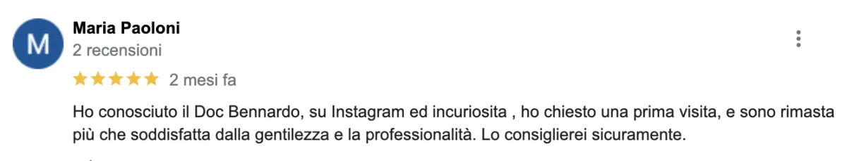 👤 "Ho conosciuto il dott. Bennardo su Instagram ed incuriosita ho chiesto una prima visita. Sono rimasta più che soddisfatta dalla gentilezza e la professionalità. Lo consiglierei sicuramente!"